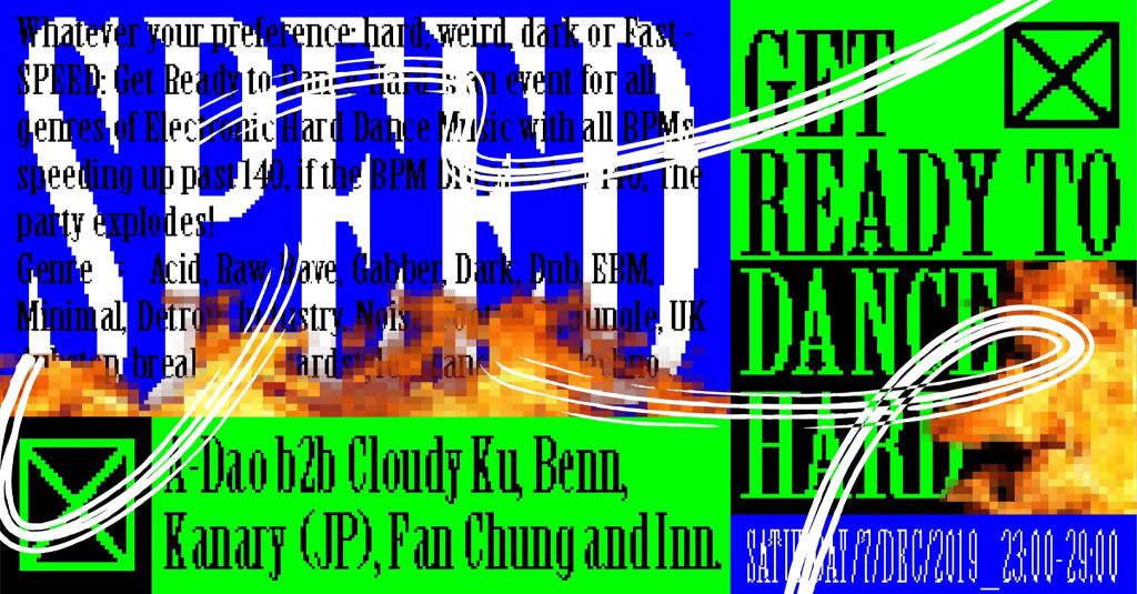 SPEED: Get Ready to Dance Hard是一場聚集各種新舊流派硬底DJ/ Producer的銳舞派對,無論您偏好哪一種高速科技舞曲:生、黑、怪、酸、核、塞、極簡、工業、底特律、足療、叢林、鼓打貝斯、噪音、硬派、勸世或是鐵克諾等其他極速樂風,現場無上限(140BPM+)的SPEEDY音速也許能夠讓您Get Ready to Dance Hard(跳乎伊爽)。