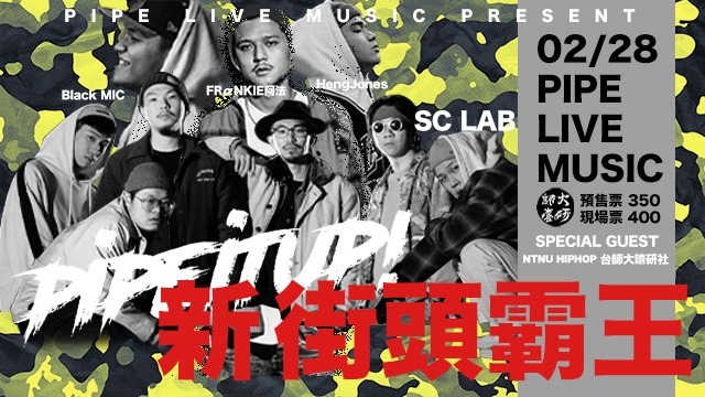 繼上回彼得魚、韓森、呂士軒以及鐵巨人呈現的「街頭霸王」,”PIPE IT UP!”也在2/28連假的第一天再次重磅推出超強卡斯之「新 街頭霸王」,這次的活動的主要嘉賓由”SC LAB”(是前為音樂團體「社會中的孩子」)以及來自說唱團體DATS DA SHIT,於去年推出專輯”Mic Check”饒舌圈人稱黑麥的”Black MIC”和來自花蓮的全創作嘻哈音樂人”HengJones”,以及近期剛丟出火燙單曲「尻一尻睡」的 FRαNKIE 阿法,即將於二月二十八的「新 街頭霸王」中齊聚一堂,一同開啟2020春最炸的嘻哈現場!