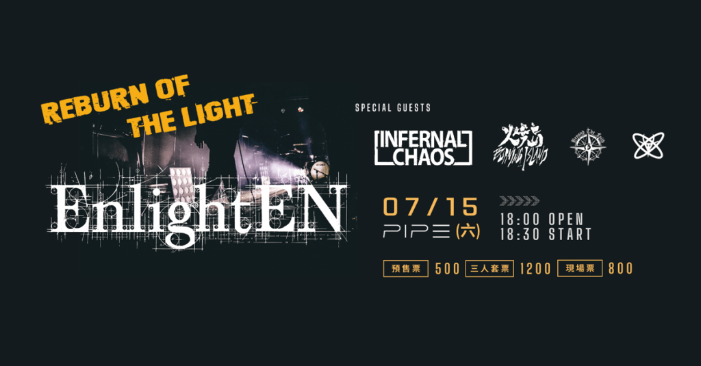 此次演出不僅是EnlightEN 樂團的復出,更是一場共同榮耀的聚會。INFERNAL CHAOS、火燒島、Beyond The Faith以及𝐕𝐞𝐠 𝐎𝐮𝐭廢物青年,這些優秀的好友共演團將與EnlightEN樂團攜手合作,